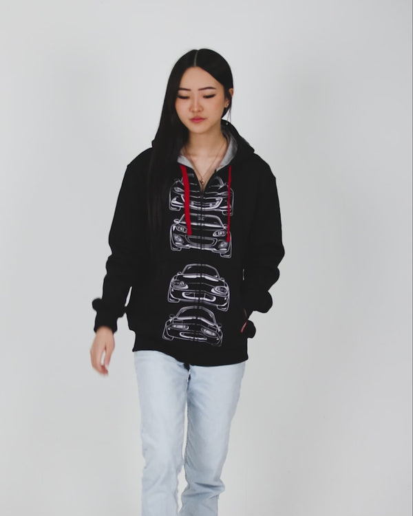 This high-quality tailored hoodie features bold and vibrant prints of the iconic ND, NC, NB and NA Miata Models, with the front and rear ends of each model on the front and back respectively and extra prints on the sleeves and hood, making it the perfect pick for any Mazda fan.