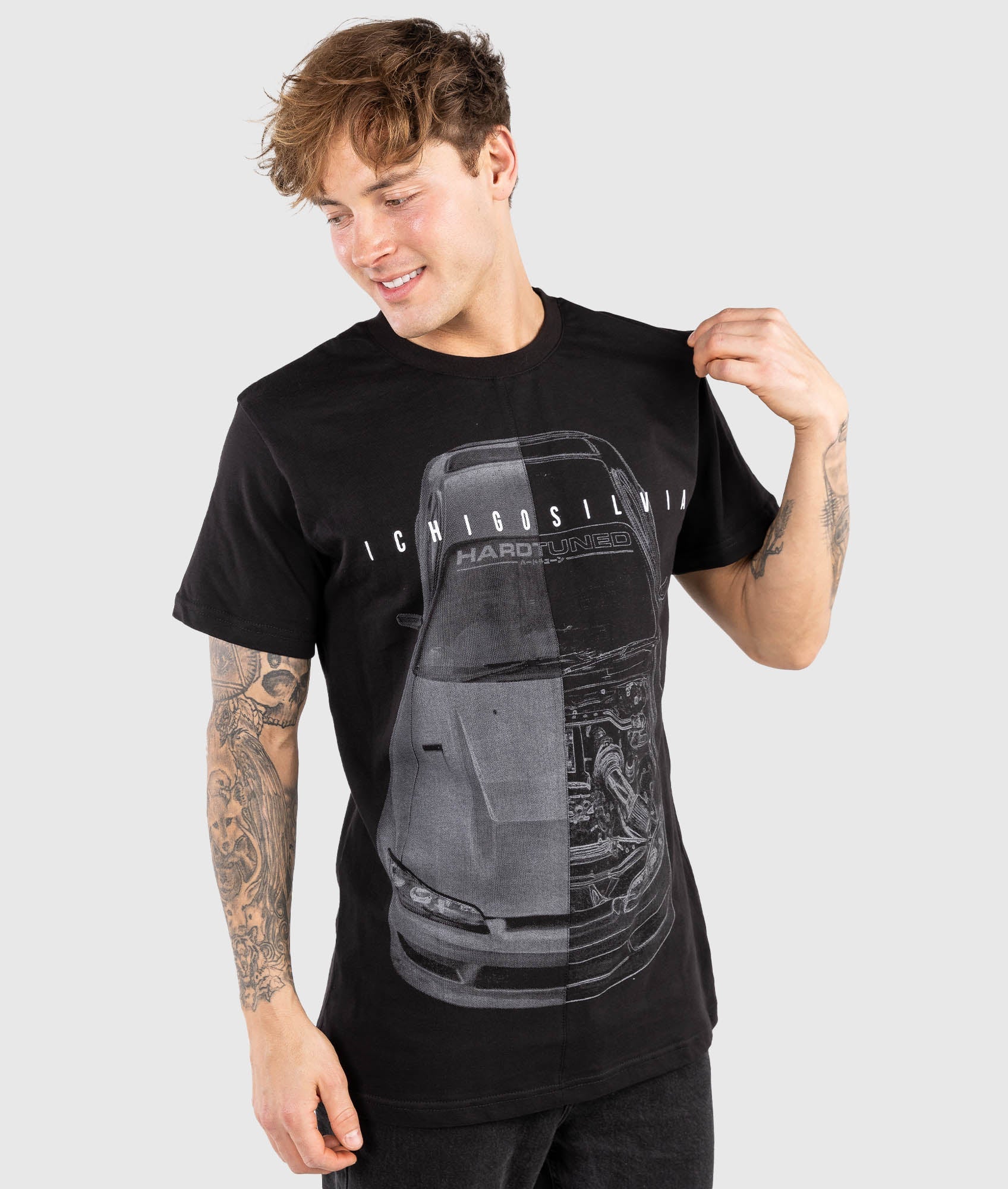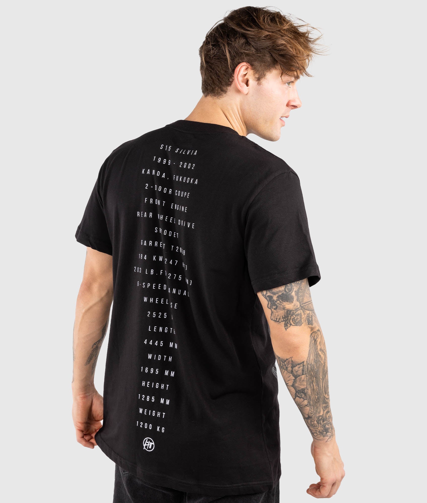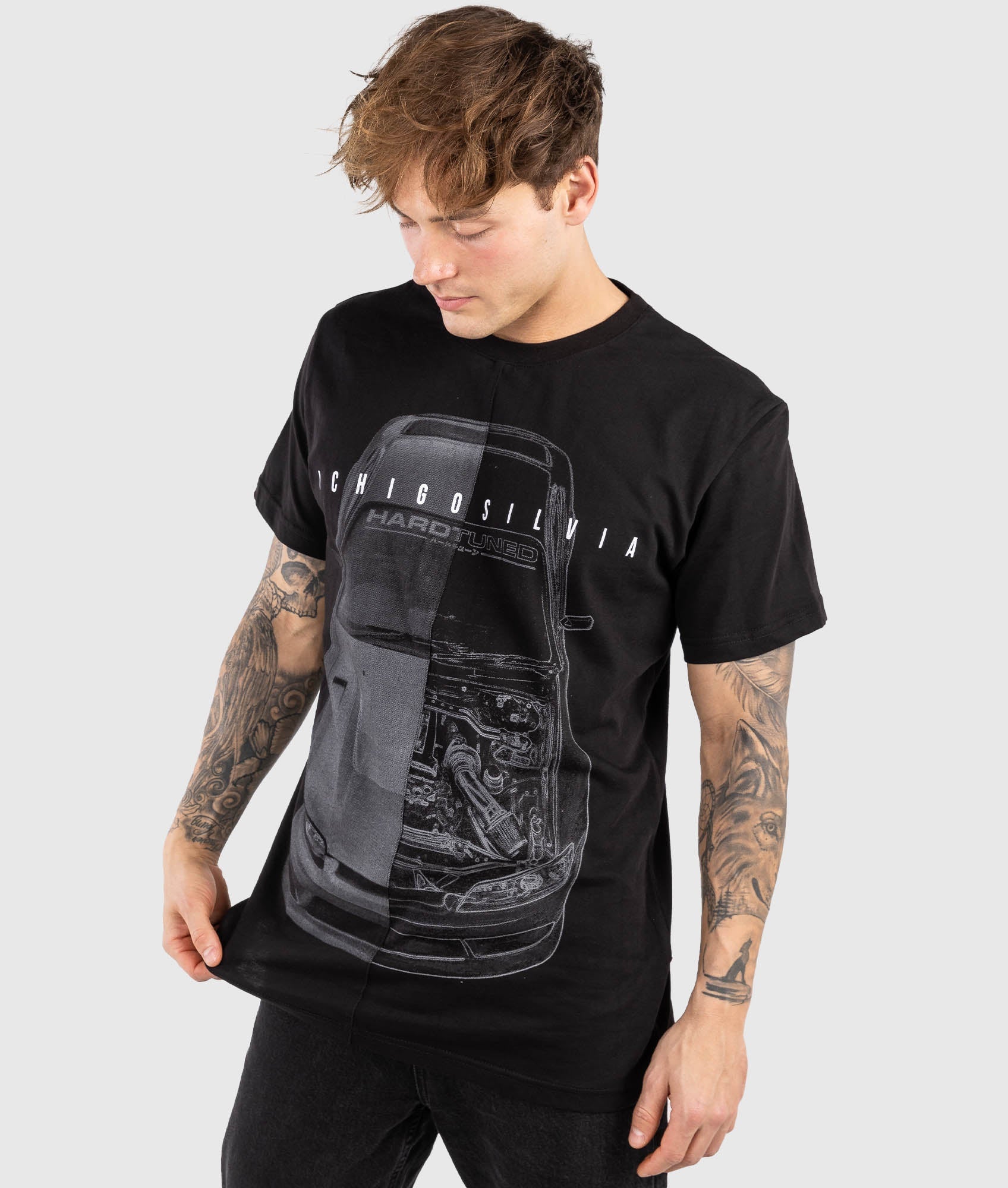 The iconic Nissan S15, now on our split tee design. Featuring half photo & half artistic blueprint, each split tee is assembled from two separate prints, sewn together, then reprinted again after assembly to create a unique finish