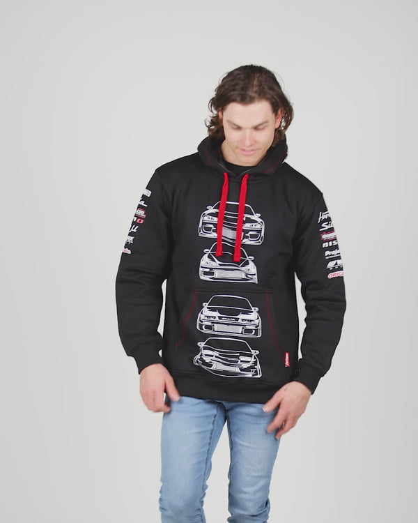 This hoodie is the best way to show off your love for the Silvia with front ends of each model on the front that line up perfectly with the zip and rear ends on the back, it also features extra print on the hood and sleeves for added style.